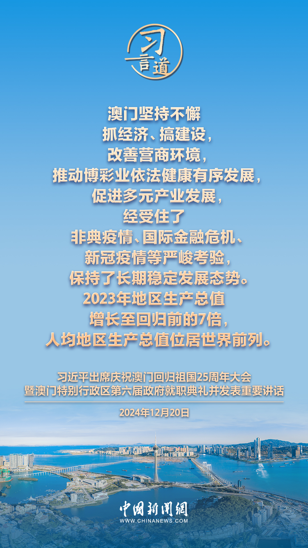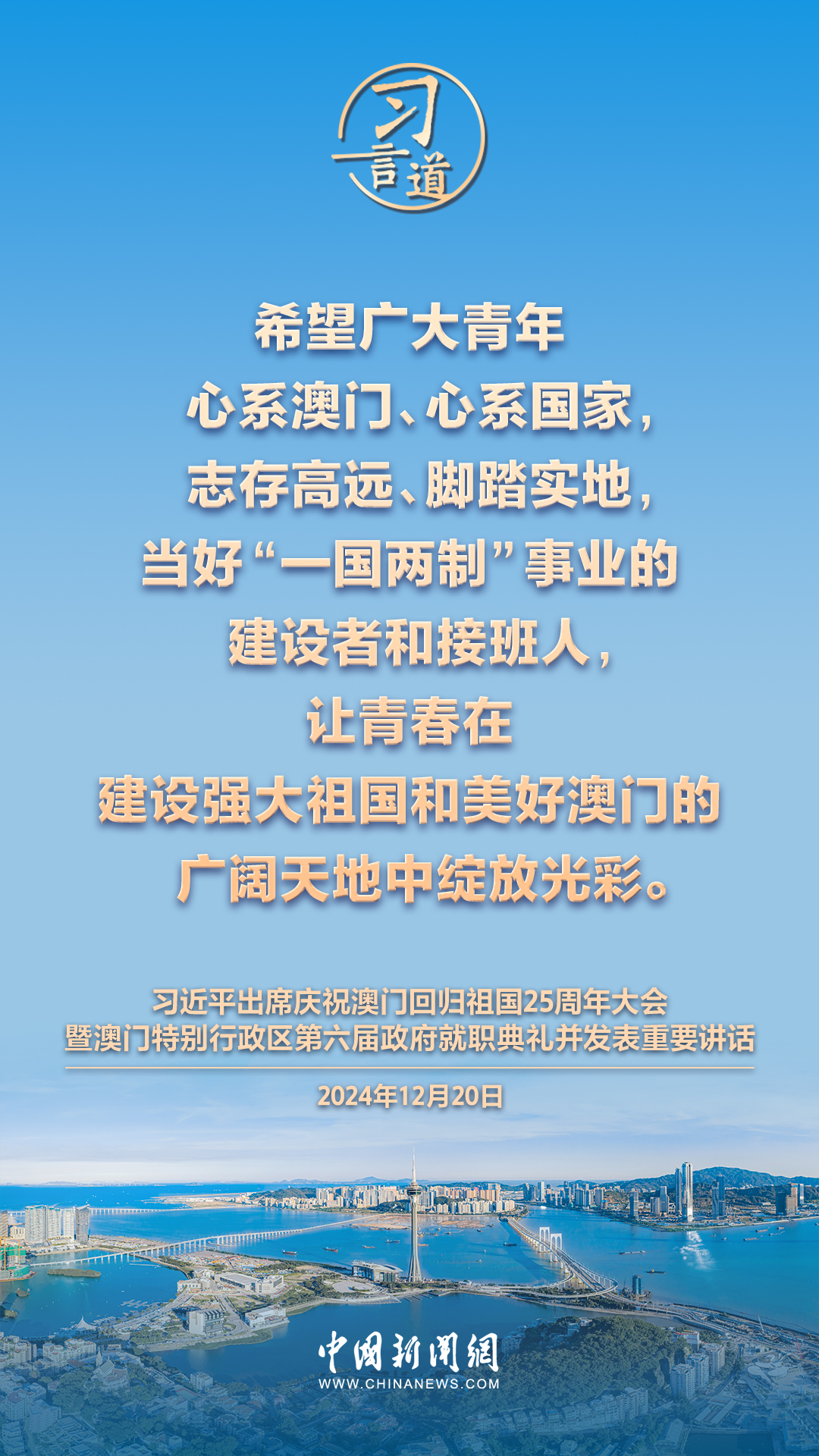 庆祝澳门回归祖国25周年大会暨澳门特别行政区第六届政府就职典礼20日在澳门东亚运动会体育馆隆重举行。中共中央总书记、国家主席、中央军委主席习近平出席并发表重要讲话,习近平指出——